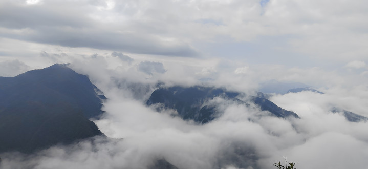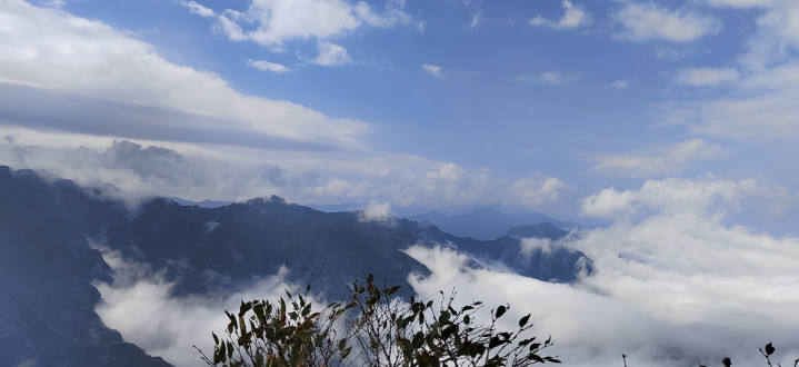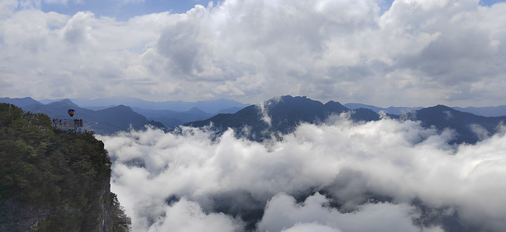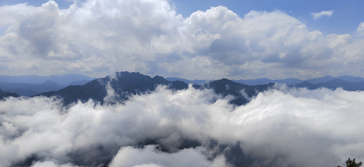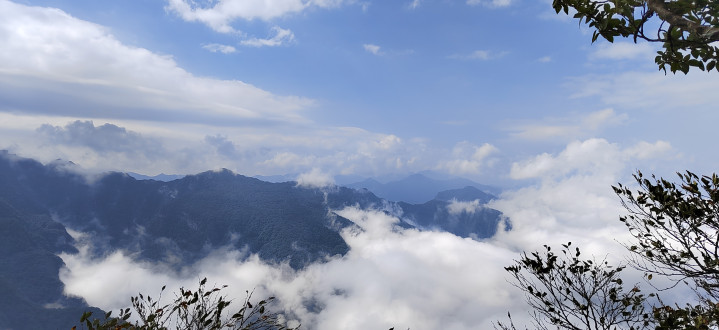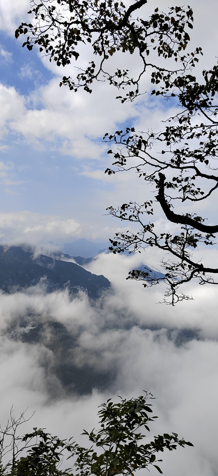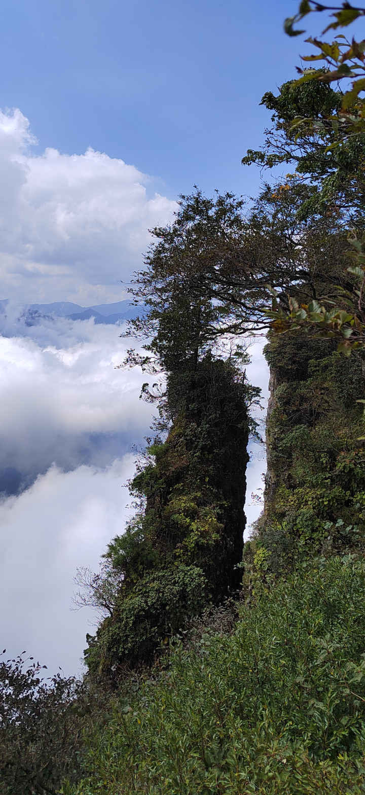 安身不雅景台遥看,斑斓秋林与皑皑云海相拥,红叶在云隙间半明半暗。待潸潸稍散,边远峰峦详尽渐显,与脚卑劣动的云涛相映,分不清是山在云中,依然云在山间。此景打扰,唯觉尘心尽洗,只剩六合广袤与云海暄和。