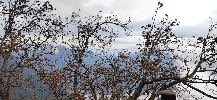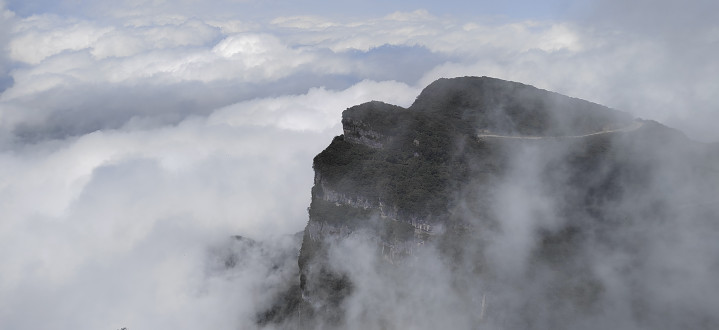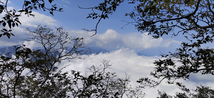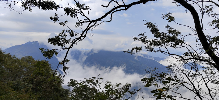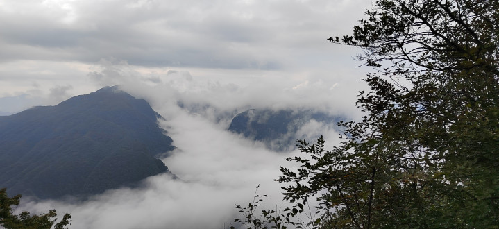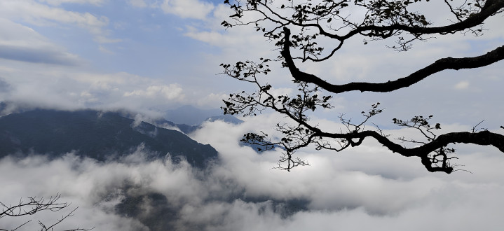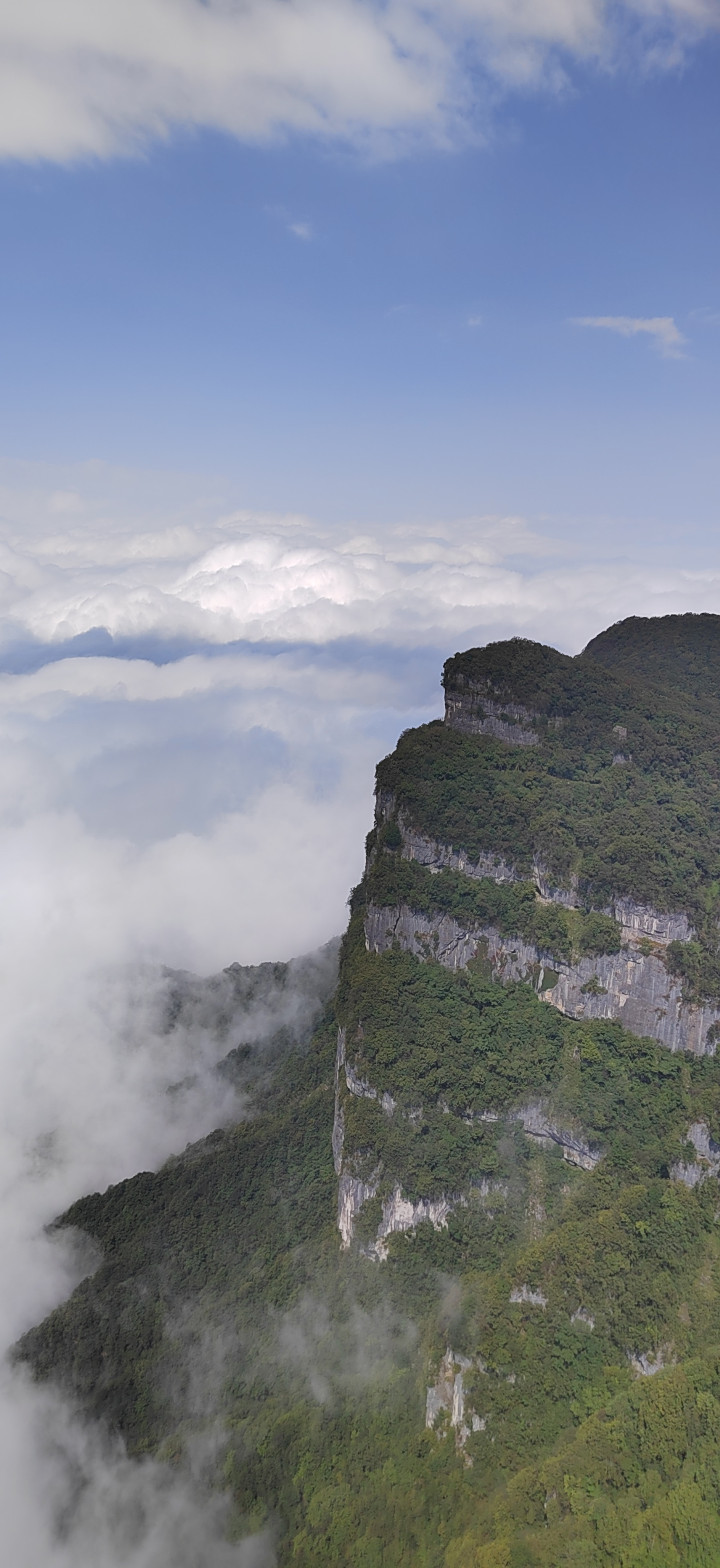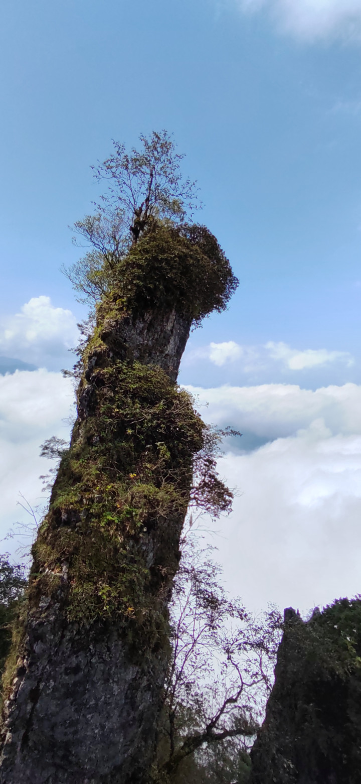 安身不雅景台遥看,斑斓秋林与皑皑云海相拥,红叶在云隙间半明半暗。待潸潸稍散,边远峰峦详尽渐显,与脚卑劣动的云涛相映,分不清是山在云中,依然云在山间。此景打扰,唯觉尘心尽洗,只剩六合广袤与云海暄和。