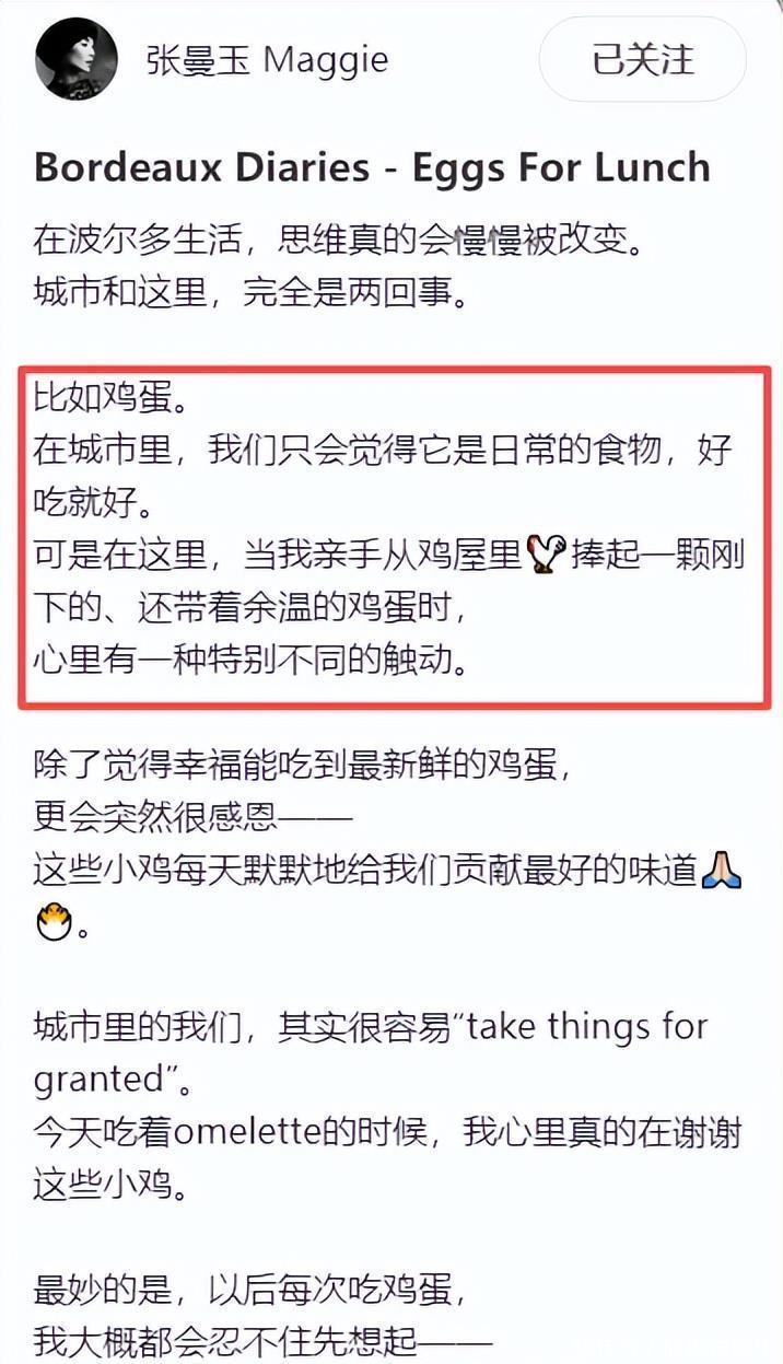 她在视频案牍里写,在城市里,鸡蛋仅仅日常食品,可在波尔多的乡村,亲手捡起一颗崭新鸡蛋时,心里尽是幸福和感德。