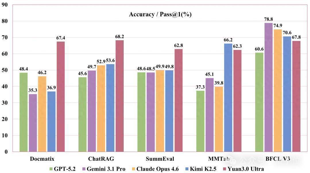 Yuan3.0 Ultra在ChatRAG、SummEval等检索增强生成评测中阐扬越过于Claude Opus 4.6、Gemini 3.1 Pro、GPT-5.2等最新前沿模子,体现出模子在检索阻挡基础上进行深度语义整合与生成回复的身手。