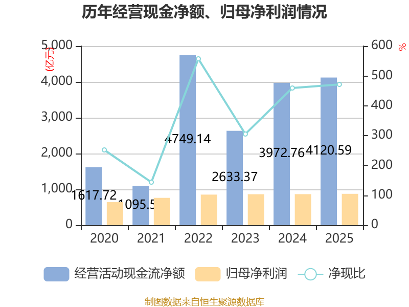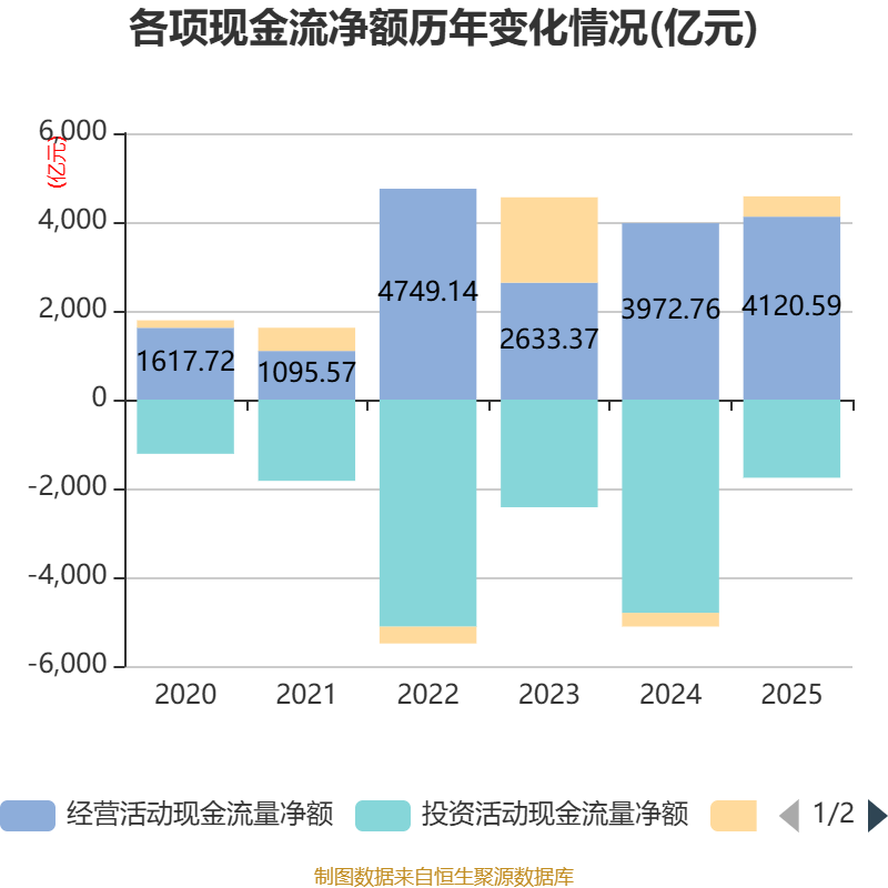 戒指2025年,公司筹算行径现款流净额为4120.59亿元,同比增长3.72%;筹资行径现款流净额457.44亿元,同比增多765.22亿元;投资行径现款流净额-1759.34亿元,上年同时为-4803.99亿元。