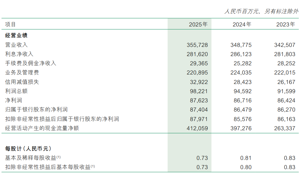 中证智能财讯邮储银行(601658)3月28日清晰2025年年度阐扬。2025年万博体育,公司终了买卖总收入3557.28亿元,同比增长1.99%;归母净利润874.04亿元,同比增长1.07%;扣非净利润879.71亿元,同比增长2.80%;筹算行径产生的现款流量净额为4120.59亿元,同比增长3.72%;阐扬期内,邮储银行基本每股收益为0.73元,加权平均净钞票收益率为8.67%。公司2025年度分派预案为:拟向举座鼓吹每10股派现0.953元(含税)。
